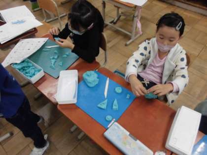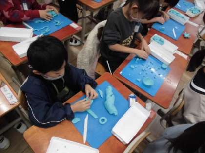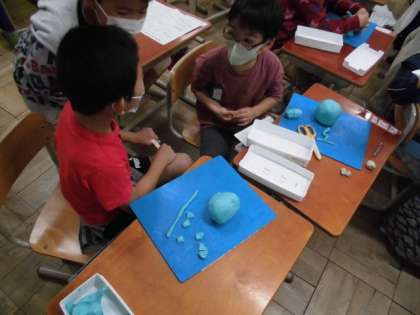 今日の中間休みは、あいにく雨が降っていました。楽しみにしていた外遊びもできません。そんな時は教室で過ごす方法を考えます。読書やタブレット、ねん土など自分のやりたいことをして過ごします。ねん土で美味しそうな食べ物を作っている子もいて、チャイムが鳴ると「もっと作りたい」と残念そうに片づけていました。
