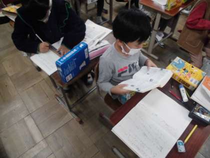 おとなりの国、中国に伝わる古い出来事や物語がもとになってできたことわざのような言葉を故事成語といいます。今日は、国語辞典を使って、「矛盾」や「漁夫の利」などの故事成語の意味を調べました。なかなか見つからなかったりどの部分を書けばいいのか迷ったりしましたが友達と相談しながら調べることができました。
