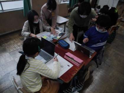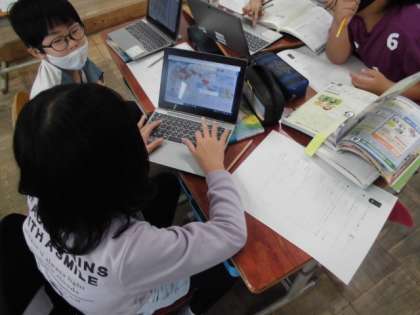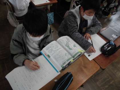 国語の時間には、各自で今の社会が暮らしやすいか暮らしにくいか立場を決めて、自分たちで選んだグラフや表をもとにメモしていきました。本やインターネットで見つけたグラフや表を見て、書かれている内容や大切な言葉などをプリントにメモしていきました。