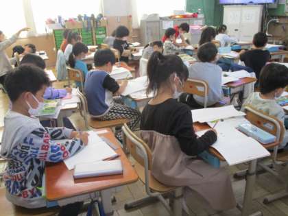 国語科「しらせたいな 見せたいな」の学習では、学校にいる生き物のことを知らせるための文章を考えています。