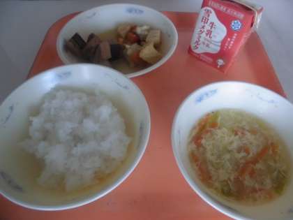 「『なま節と厚揚げの煮つけ』は,魚も味がしみこんでいて,おいしかったし,にんじんやたけのこもおいしかったです。『キャベツのかきたま汁』は,卵が入っていて,おいしかったです。」と,感想をくれました。