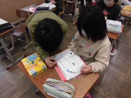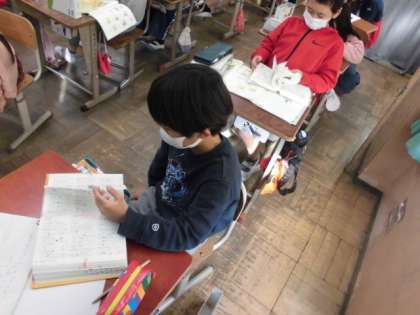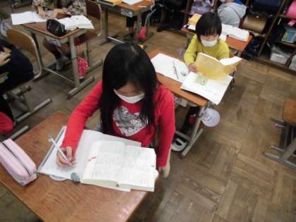 「おびに短し たすきに長し」のように昔から伝わることわざを耳にしたこともあるようです。今日の国語では、国語辞典を使ってことわざの意味を調べました。「猿も木から落ちる」って聞いたことあるけど、どんな意味かなぁと探していると、見つかった時には喜んで意味をノートに書いていました。ノートに書き切れないぐらいたくさん見つけている子もいました。
