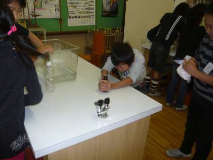 理科の学習でガラス瓶を手で握り1円玉を動かす実験を行いました。子どもたちは,一円玉が少し浮き上がる様子を見て「うわ〜!!動いた動いた!!」と,とても楽しそうに実験を行っていました。空気をあたためると体積が増えることを肌で感じることが出来たのではないでしょうか。