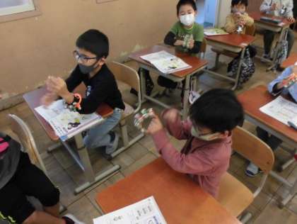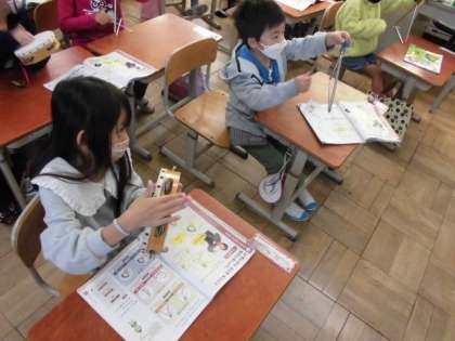 今日の音楽では、いろんな楽器となかよくなるために音探しをしました。トライアングルやすず、タンブリンを順番に使いながら、ならし方を工夫しました。ゆっくり打つのとこまかく打つのとでは音の感じも違いました。