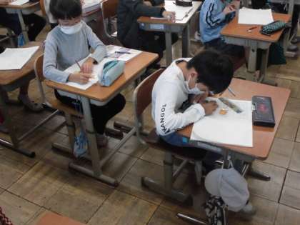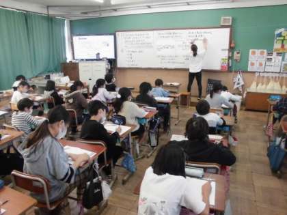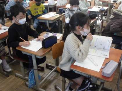 算数では、同じものをいくつか買った後に追加で買ったり割引してくれたりした時、どんな計算で求められるのか考えました。リンゴを8こ買ったけど、お店の人が60円まけてくれたので900円払うことになった時、リンゴは1こ何円なのか考えました。同じものが集まるとかけ算を使い、安くなるのならひき算を使えばいいことから、順番に逆に計算していけば求められることが分かりました。