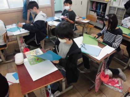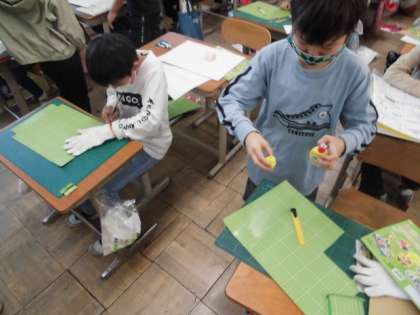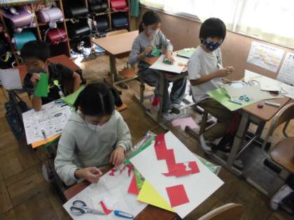コロコロガーレの設計図ができたので、今日から制作開始です。ビー玉が転がるように厚紙や色画用紙を切ってつなげたり組み合わせたりしていきます。カッターナイフを使う時は軍手をはめて安全に気を付けていました。曲がりくねったコースもあれば直線コースも考えているようで、どんな作品が出来上がるのか楽しみです。
