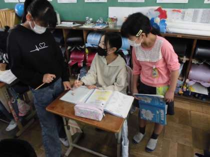 三角形や台形、平行四辺形などいろんな形の面積を求める公式を学習してきました。今日は、問題を通しておさらいをしました。公式を確認する問題や公式を使って面積を求める問題などに取り組みました。面積をたしたり引いたりしなければ求められない複雑な問題もあり、周りの人と相談しながら求めていました。