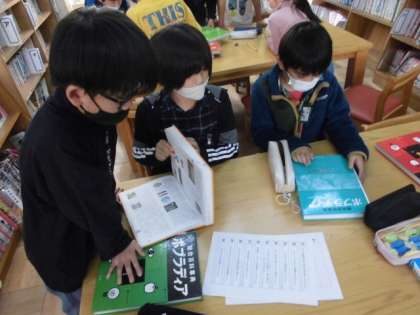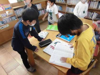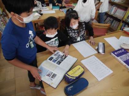いつも図書館に行くと、自分の好きな本を選んで読んでいますが、今日は、グループごとに本で調べて問題に答えていました。先生から出題された問いに対して、どの本で調べればいいか、どの部分が答えになるのか相談しながら答えていました。本は物語の世界に浸るだけでなく、分からないことも調べられると感じていました。
