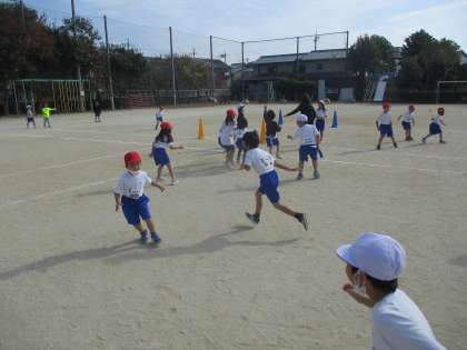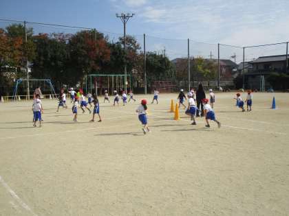 体育科の学習で「じんとりあそび」をしています。チームに分かれて、攻める側はしっぽを取られないように反対側まで走り、守る側はできるだけ多くのしっぽを取ります。ゲームが始まる前にチーム内で「ここで固まって守ろう」「時間差をつけてスタートしよう」と作戦を考えながら取り組んでいました。ゲームのたびにみんなで考えを出し合って取り組んでいました。