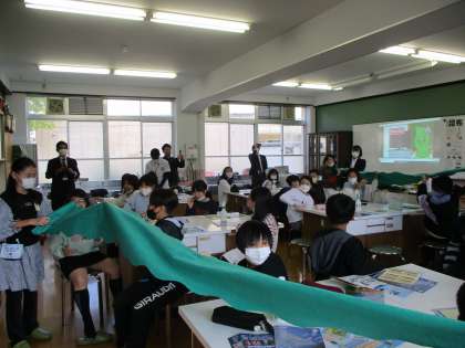 次に、昆布の生態や収穫の仕方などを教えてもらいました。昆布は全長が20mになるものもあり、収穫に使うかぎ棹という長い柄の棹を見せてもらい、子どもたちはびっくりでした。