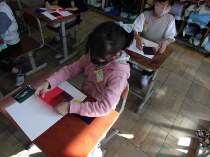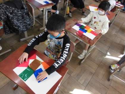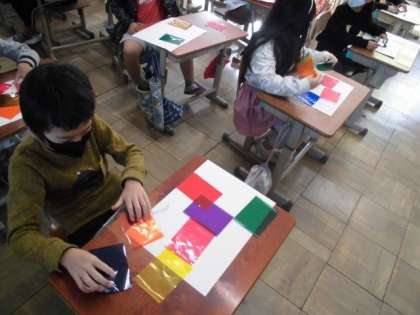 図工の時間には、色のついたセロハンを画用紙の上で重ねたり組み合わせたりしながら、自分のお気に入りの形を探しました。ななめに重ねるだけでも少し違った形ができます。また、いろんな色があるので光を通すと思っていた以上にきれいな色が出来上がります。試行錯誤しながら最後にできた形をロイロノートで写真に撮って提出していました。