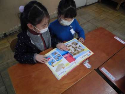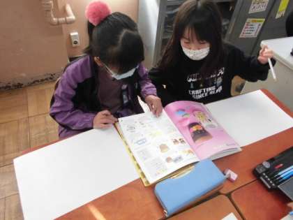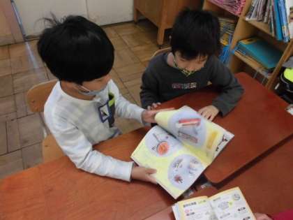 生活科では、落ち葉やどんぐりなど秋をたくさん見つけ、それを使ってみんなでできることを考えました。本を見てみると、アクセサリー作りやどんぐりごま、めいろ、魚つりなどいろんなことができそうです。今日は自分がどれをするのか、相談して決めました。早速、2人組で相談しながら材料や作り方など決まったことをメモしていました。
