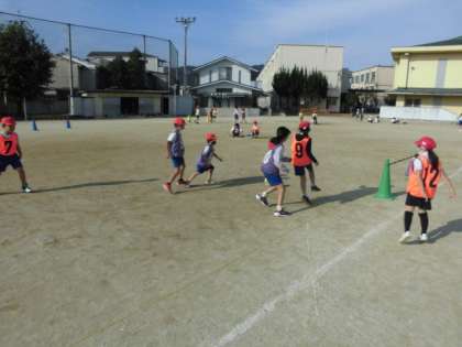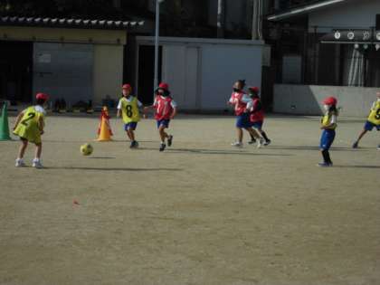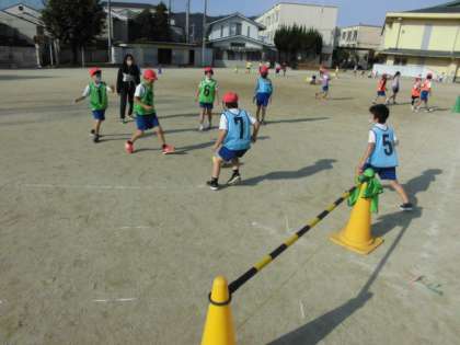 体育では、ボールけりゲームに取り組んでいます。11月ですが日中は過ごしやすいので、秋らしい気候の中、声を掛け合いながら走り回っています。少しでもゴールに近づけるようにパスのコースを工夫したりシュートされないように守りの位置を考えたりしてがんばっています。いい声が多いと、よい雰囲気の中で運動ができるので楽しそうでした。
