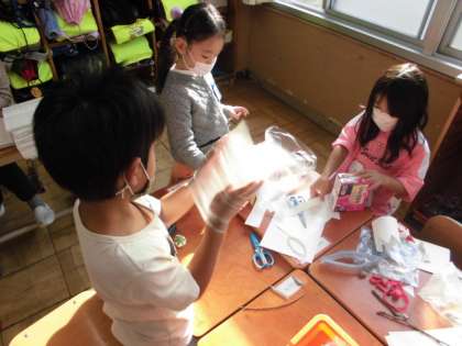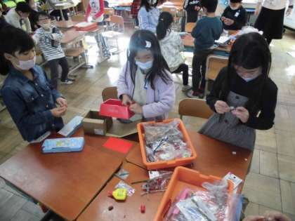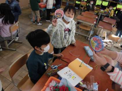 秋らしいものを使って、おもちゃ作りが始まりました。作りたいものが同じ人と協力しながら作ります。材料を分けたり作り方を相談したりしていました。「先生、できた」といい表情で完成したものを見せてくれました。交流会は少し先なので、これから準備していきたいと思います。
