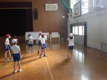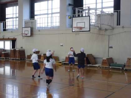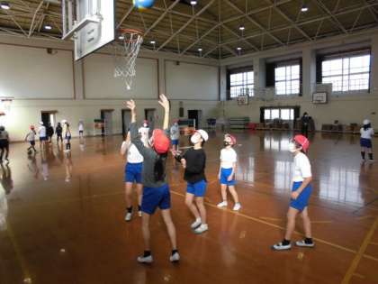 体育では、バスケットボールに取り組んでいます。今回はハーフコートで行うことにしました。攻守が変わるたびにセンターラインまで戻る必要があります。みんなが安心して取り組めるようにボールも少し柔らかいものにしました。チームメイトからの励ましもあって、どんどんシュートをねらっている姿がありました。