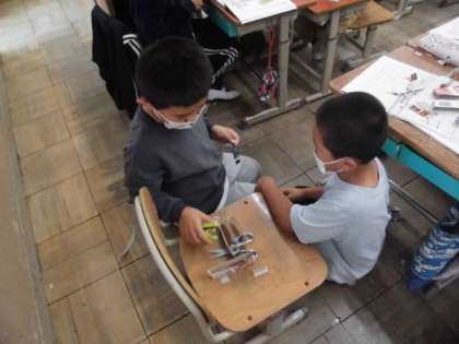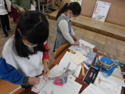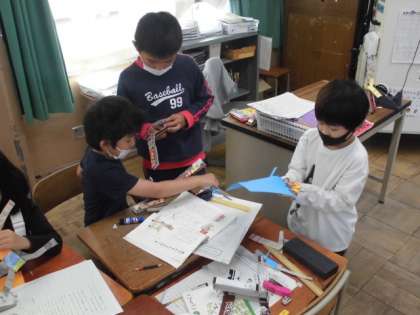 国語の時間には、箱や色画用紙を使って馬のおもちゃを作りました。教科書にある作り方を自分で読んで、その通りに作っていきます。よく読まないと、切り方や組み合わせ方といった手順が分かりません。友達と相談しながら慎重に作業を進めていました。