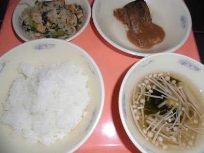 「『さばのみそ煮』は,みその味で,ごはんともよくあって,とってもおいしかったです。『切干大根の煮つけ』は,だしの味がして,おいしかったです。『すまし汁』は,えのきだけのコリコリしたのがおいしかったです。」と,感想をくれました。