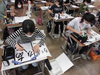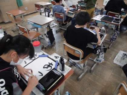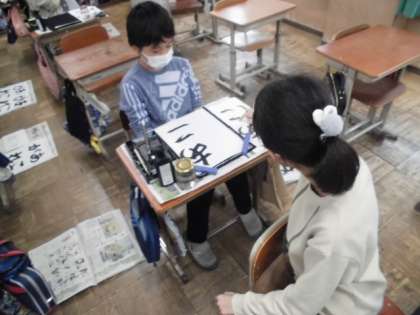 書写の時間には、「あこがれ」というひらがな4文字を書きました。ひらがなは、次の文字が書きやすいように筆を動かすことでスムーズに書けます。文字自体にも丸みがあるので少し難しいですが、集中して書いていました。