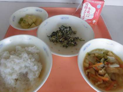 「『とりとだいこん葉のまぜごはん(具)』は,ごはんに混ぜて食べたら,とってもおいしかったです。『さつまいもの栂尾煮』は,さつまいもとえだ豆の色あいがきれいで,甘くておいしかったです。『はくさいの吉野汁』は,体が温まって,おいしかったです。」と,感想をくれました。