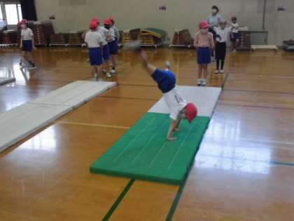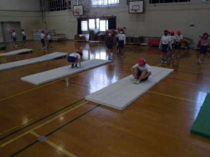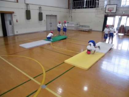 体育ではマット運動に取り組んでいます。前転や後転だけでなく開脚をしながら回ったり横に回ったりしています。自分にできそうな技に挑戦しながらお互いにアドバイスしていました。自分では気づかないこともあるので、意見に耳を傾けながら取り組んでいました。