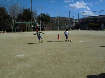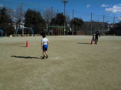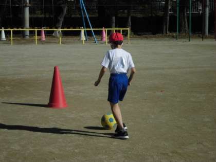 体育の時間には、ボール運動にあ取り組みました。カラーコーンが置いてあるところまで足でボールを進める練習をしました。あんなり強くけり過ぎるとボールがどこかへ行ってしまいます。力加減をきにしながら少しずつ進むようにしていました。