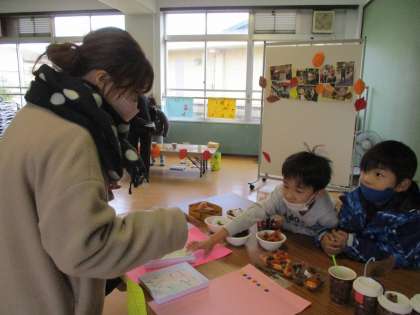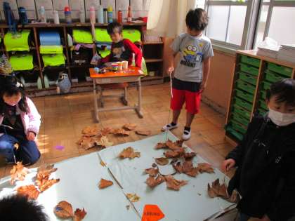 ドングリゴマや魚釣り、アクセサリーやさんなど、ドングリ、落ち葉、マツボックリ、木の実など、秋に見つけた自然のものを使った楽しいコーナーがたくさんでした。