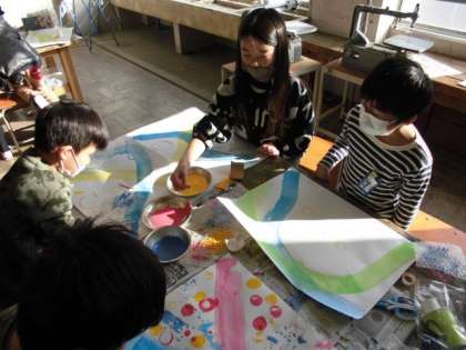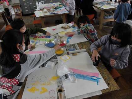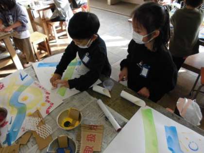 今日の図工では、自分で選んだ色をつけたローラーで画用紙に色を塗った後、段ボールやカップ、野菜などおうちから持ってきた材料を使ってスタンプをしました。赤や青、黄色の中から選んだ色で押していきます。予想していたのとは違う形ができたりきれいにできたりして、とても楽しそうに何度もスタンプしていました。