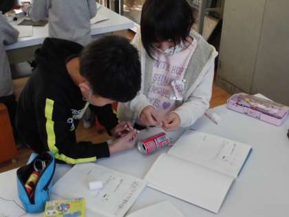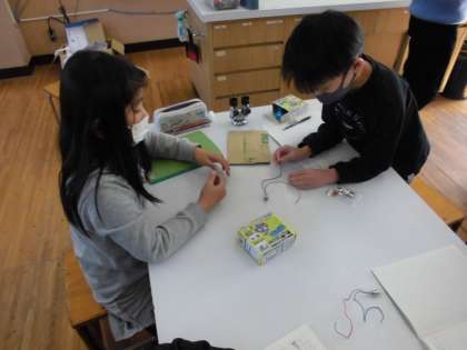 くぎ、ダンボール、あきかん、わごむなど身の回りにはいろいろなものがあり、できている素材もちがいます。今日の理科では、これらのものが電気を通すのか実験しました。乾電池と豆電球をつなげた動線に触れさせることで明かりがつけば、電気が通るということが分かります。一人では難しいので、協力して実験しました。予想と違うものもあって、新たな発見もあったようでした。