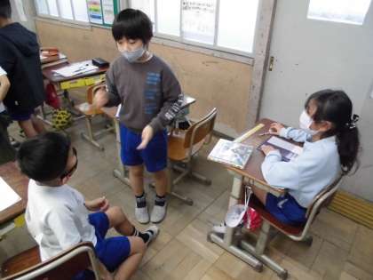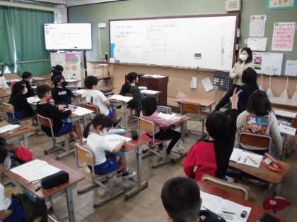 1/5を6個集めたらどんな分数で表せるのか考えました。1を同じ大きさに分け、いくつ分にあたるのか考える必要があります。1/5を3つ集めると3/5になることを参考に考えてはいるものの1/5、5/6、6/5と3つの答えが出てきました。さて、いったいどれが正解なのか近くの人と話し合いました。