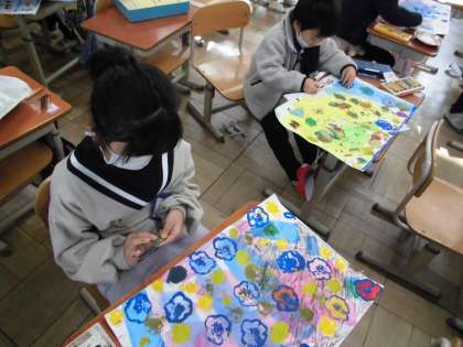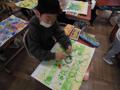 ローラーとスタンプでカラフルになってきましたが、いったい何に見えるでしょう?向きを変えたり視点を絞ったりしながら、自分の作品が何に見えるか考えました。見えてきたものから顔を描いたり色を塗ったりしていました。