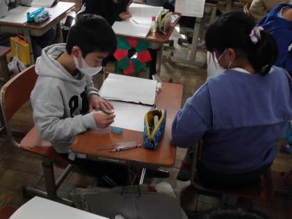 最近はグッと寒くなって風も冷たく冬らしい季節になりました。毎日、季節を感じながら生活をしていると何気ないことを見逃してしまうことがあります。ふと空を見上げれば雲一つないきれいな空だったり休み時間に鬼ごっこをして楽しんだりと心で感じることはたくさんあります。今日の国語では、心が動いたことを思い出して詩に表しました。ノートに下書きした後、画用紙に清書していました。