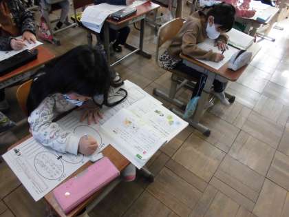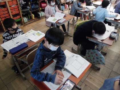 登場人物の名前や特徴を決めたので、今日は「はじめ・なか・おわり」の3つの部分に分けて順番にお話を考えました。物語の始まりはどんな場面にしようかな?そこからどんな展開にしようかな?最後はどうなっていくことにしようかな?と全体のお話の流れをイメージしながら書いていきました。どんどんアイデアが浮かんでくるようで、楽しそうにお話を作っていました。
