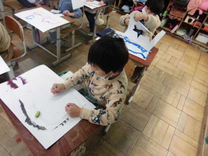 今日の図工では、これまでに作ってきた版を使って、画用紙に写し出しました。向きや色を工夫して画用紙に写そうとしましたが、水の量が多くなって絵の具が広がってしまいそうになりました。また、細かすぎても形が出にくいことが分かったので、画用紙のスペースも考えながら版の大きさや形を改善できるように作り直しました。