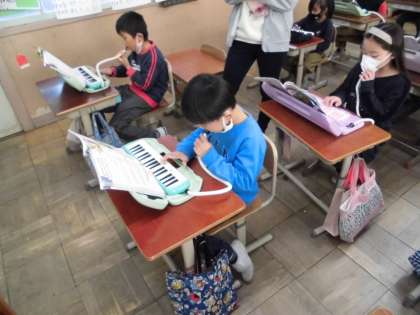 「こぎつねコンコン やまのなか」というフレーズで有名な小ぎつねという曲を鍵盤ハーモニカで演奏しました。「こぎつねコンコン」のところはいいのですが、「やまのなか」のところの指づかいが難しそうでした。慣れないうちはゆっくり演奏するようにしました。