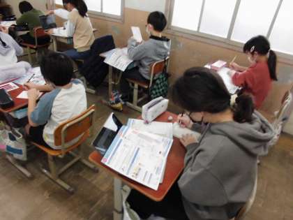 今日はクラスで年賀状を書きました。年賀状の書き方の参考となる資料を見ると、どんな言葉をかけばいいか、どんな挿絵がふさわしいかなど、参考になる情報がいっぱいです。配られたはがきに自分の名前と相手の名前が書けたら、裏面の内容を考えていました。