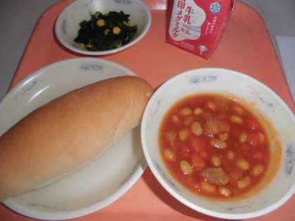トマト味の献立です。パンと一緒に味わって食べました。