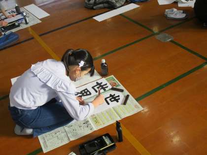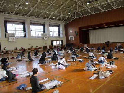 5年生は1・2時間目に「新春書き初め大会」を体育館で行いました。正月らしい曲が流れる中、心を落ち着けながら、毛筆で「世界の国」と書きました。いつもの半紙と違って長い画仙紙を使うので、文字の大きさや位置に気をつけながら、真剣に書いていました。書き終えた自分の作品を見て、笑顔を見せる子もたくさんいました。