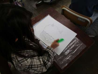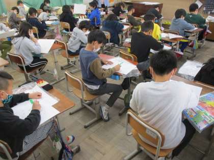 3年生は図画工作で版画に取り組んでいます。思い思いに描いた鬼の顔を、どこを黒くし、どこを白くするか考えながら、板をへこませていきます。鬼の顔とにらめっこしながら、しばし考えたのち、集中して作業を進めていました。どの鬼も個性的で、どんな版画になるのか楽しみです。