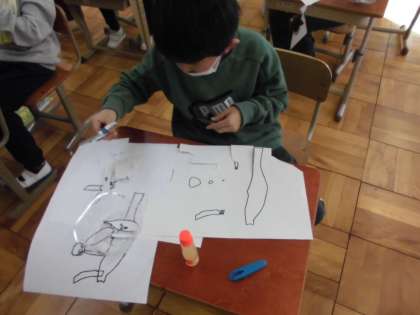 図工の時間には、紙版画に挑戦しています。紙に描いたパーツをペンでなぞってから1つ1つ切り取りました。曲線もあるので線の上を慎重に切っていました。全部切り取ることができたら組み立てて形にしていきます。