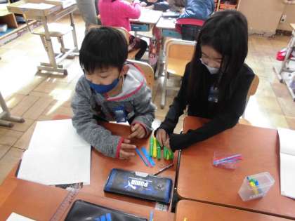 今日の算数では、数え棒を使ってどんな2ケタの数字になるか考えました。10のたばが5つとバラが6つで「56」になります。10のたばが6つだけなら「60」になります。10がいくつと1がいくつなのか考えてから数字を答えていました。