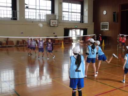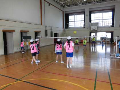 バレーボールとはちがい、ビーチボールよりも軽い素材でできたボールを使って、ソフトバレーボールに取り組んでいます。軽い分、空中に浮いている時間が少し長いので、床に落ちにくいです。なかなか思った通りにレシーブしたりつないだりすることは難しいですが、なんとか相手に返そうとみんな一生懸命でした。