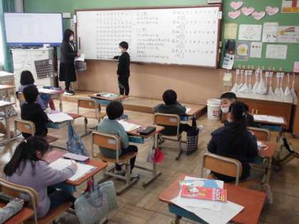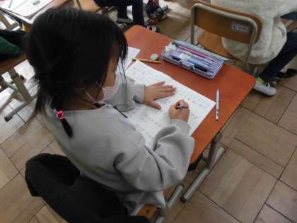 今日の算数では、縦横きれいにそろえて書いた100までの表を使って、数の仕組みを考えました。右に1ずつ増えることや縦に10ずつ増えることに気づけました。さらに表を使って、「49より1大きい数」や「85より4小さい数」などを見つけました。