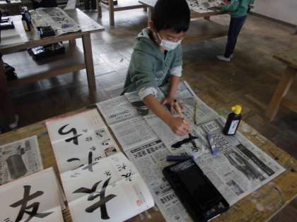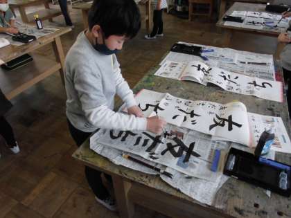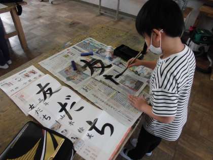 今日の書写は、新聞紙を使って書き初めの練習をしました。いつもより縦長の紙を使うので、文字の大きさやバランスの感じが違います。そのあたりを気をつけながら練習しました。ひと文字目を書く時に思っていた以上に遠かったり紙が大きかったりしましたが、慎重に書いていました。
