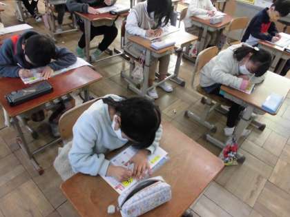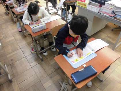 今日、学習する漢字は「矢」と「谷」です。とめるところやはらうところをみんなで確かめた後、とめ・はね・はらいなどに気を付けて書きました。お手本のような字になるように丁寧に書いていました。