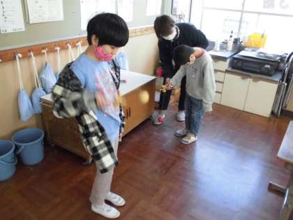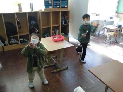 新年を迎えたこともあって、今日はお正月にちなんだ遊びを体験しました。こま回しやけん玉、お手玉を順番に体験しました。お手玉では、上に投げたものが落ちてくる間にすばやく持ち替える必要がありますが、手元を見ていてはキャッチできません。タイミングを合わせて持ち替えるようにしていました。