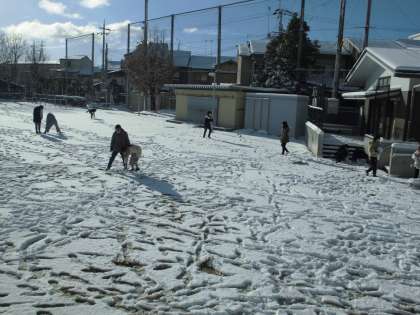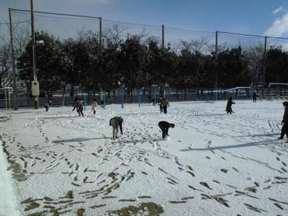 昨日からの雪が積もって、運動場も一面、雪の世界が広がっていました。雪が融ける前にみんなで雪遊びをしました。