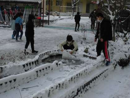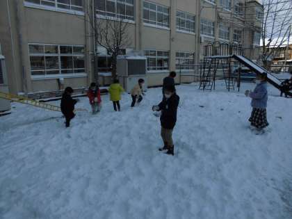 中庭の池には氷が張っていて、触ってみるといつもより分厚い氷だったので、驚いていました。雪を転がしていくと、大きな雪のかたまりになりました。ちびっこ広場にもたくさん雪が積もっていました。