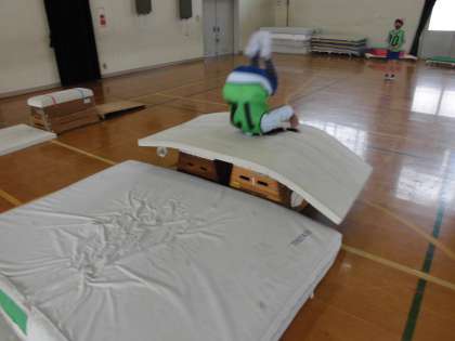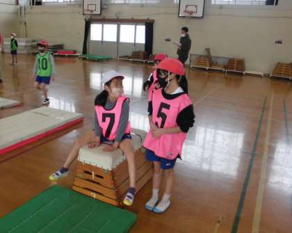 とび箱をいろんな跳び越し方で挑戦しています。今日はかかえ込み跳びに挑戦する人が多かったです。新しい技に挑戦するので、安全な場づくりを心がけると、安心して挑戦できます。自分が跳んだ様子を見てもらって、友達からアドバイスをもらって次に生かそうとしていました。
