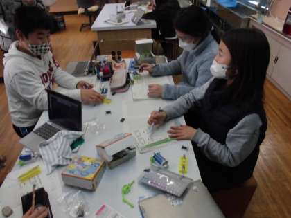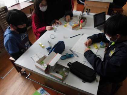 磁石には+極と−極があるように、電磁石にも極があります。ところが、電磁石の場合は、極を変えられるようです。どうやったら変えられるのか、電池の向きに着目して実験しました。方位磁針のふれ方で確かめるようにしていました。