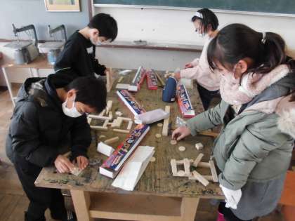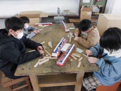 図工の時間に取り組んでいる工作では、木をのこぎりで切り分けてパーツを作ります。自分で考えた設計図通りにパーツを作れたので、今日は紙やすりで切り口を磨きました。きれいに磨くとツルツルしていました。